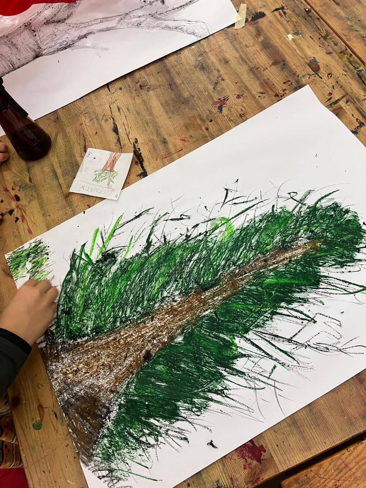 Vyzkoušíme si delší procesy tvorby obrazů. Pro ztvárnění krajiny budeme využívat různé výtvarné techniky a také je spolu kombinovat. Nejdříve skicovat na našem zeleném dvorku a v parku podle živé přírody a v ateliéru převedeme skici do obrazů na větší formáty a také na obraz na plátně. Děti se naučí jak si rozvrhnout obraz do plánů (pozadí, popředí, motiv) i jak pracovat s kompozicí barev.